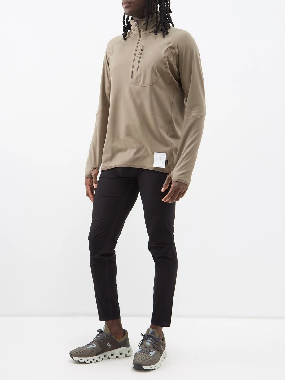 Satisfy’s beige GhostFleece™ is crafted from moisture-wicking, odour-resistant Polartec® Power Grid™ jersey with flat-locked seams for optimum comfort when running and training.