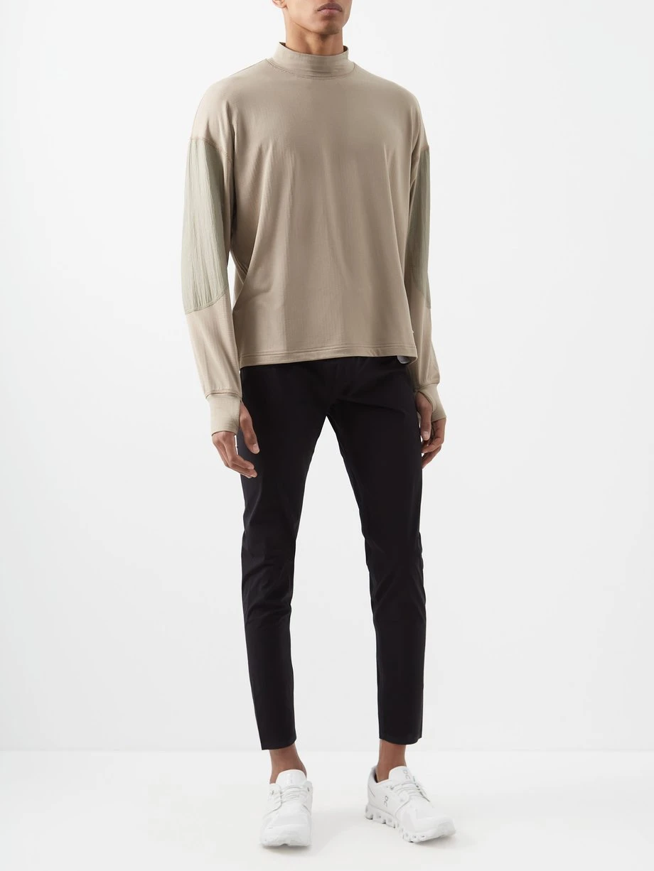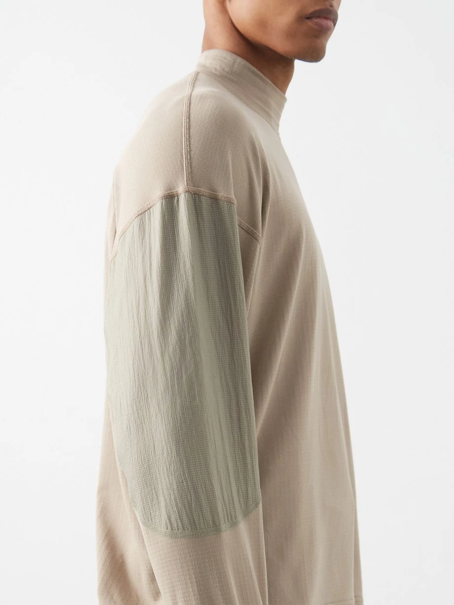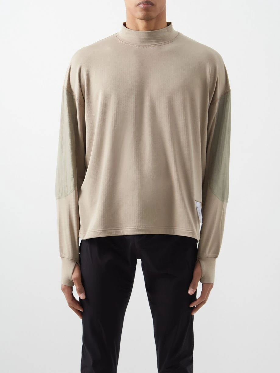 Satisfy’s beige GhostFleece™ is crafted from moisture-wicking, odour-resistant Polartec® Power Grid™ jersey with ripstop sleeve panels and flatlocked seams for lightweight warmth when training.