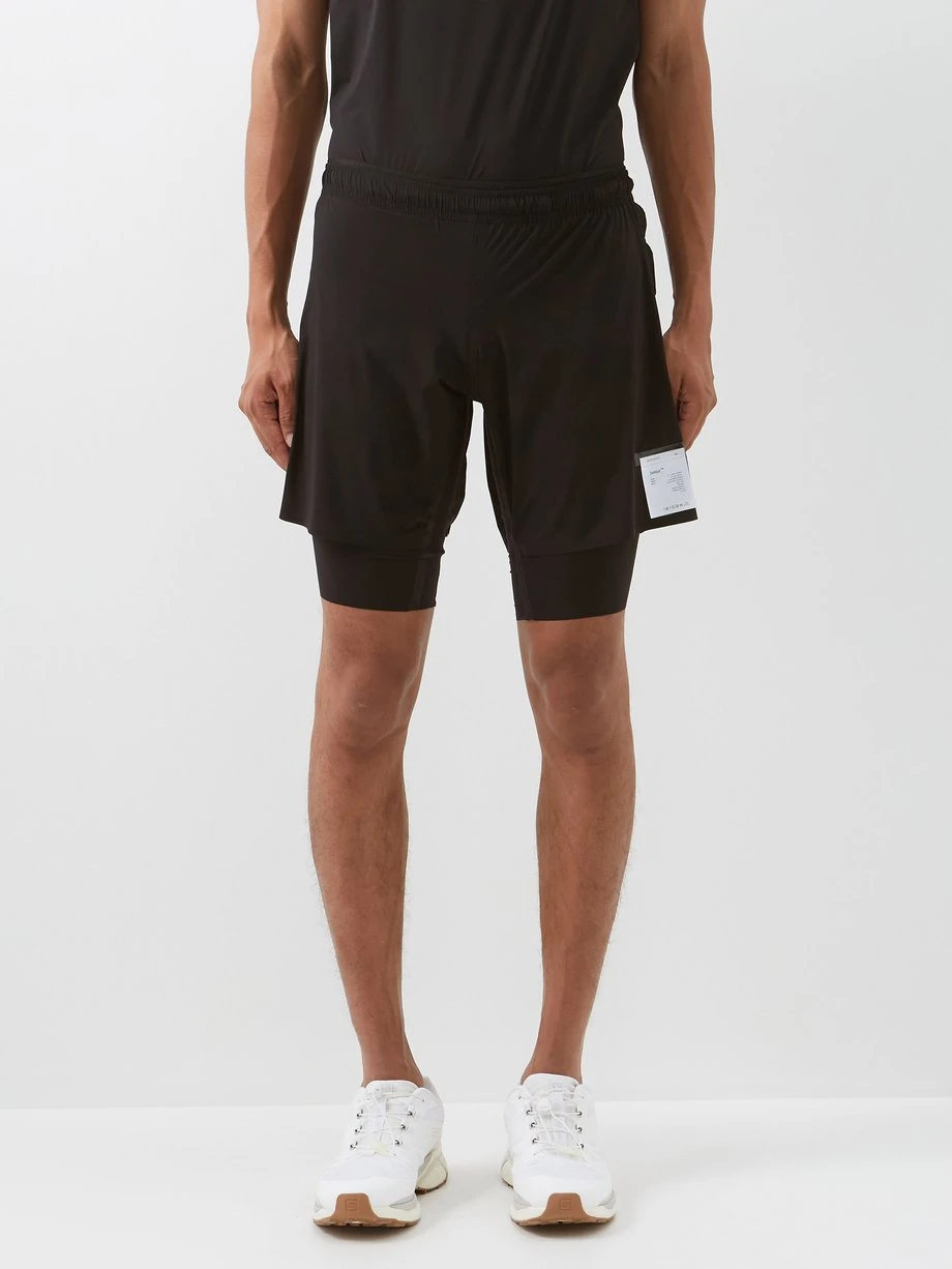 Satisfy’s black track shorts are made from moisture-wicking jersey with a drawstring waist and under-layered tights, which prevent chafing while running.