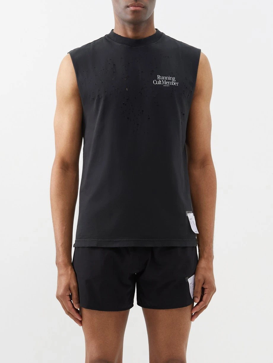 Satisfy strategically perforates this black sleeveless T-shirt with MothTech holes, providing breathability and ventilation during exercise.