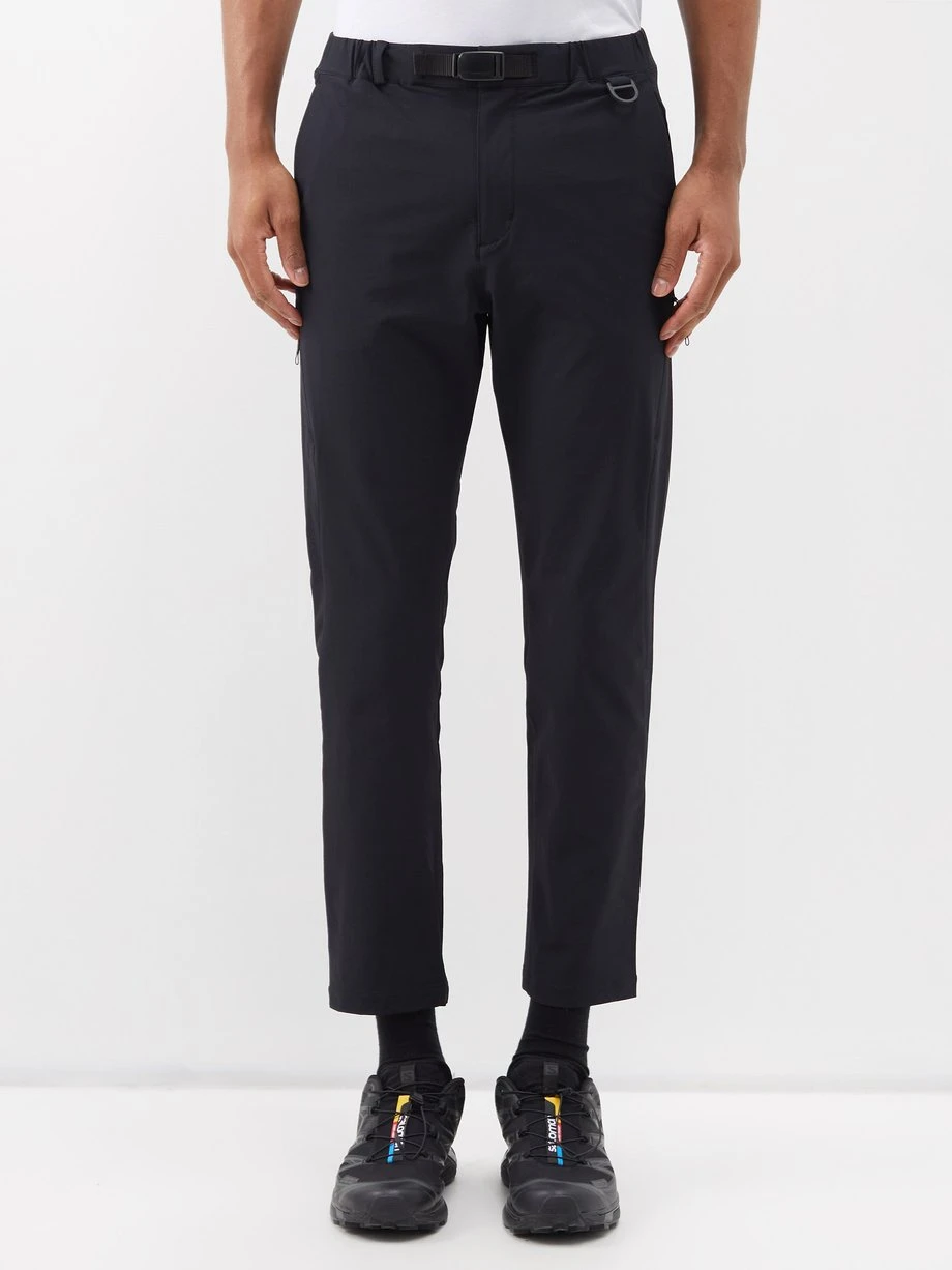 Snow Peak’s black Active Comfort trousers are cut to a slim leg and secured with a buckled belt around the waist.