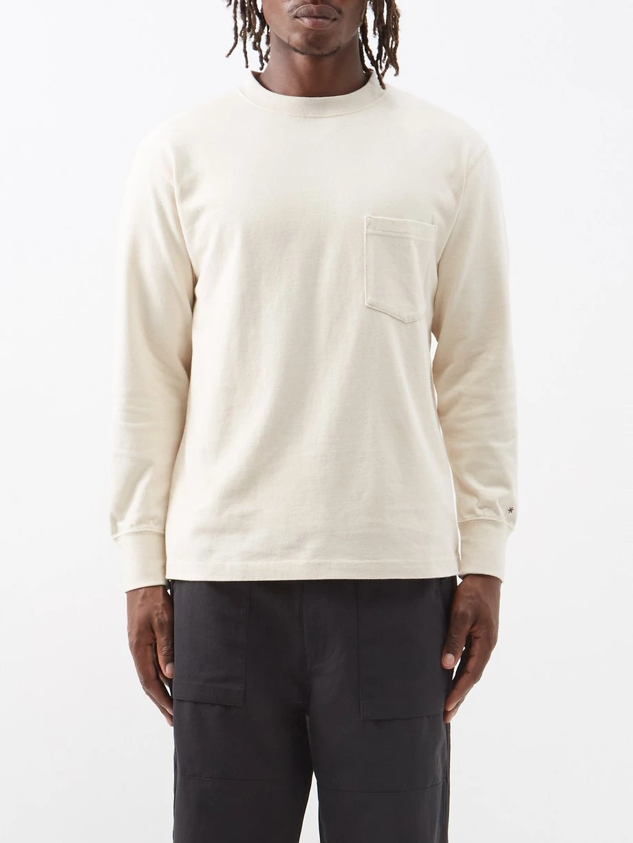 Made from soft cotton jersey using partially recycled yarn, Snow Peak’s white long-sleeved T-shirt has a thicker handle for extra comfort.