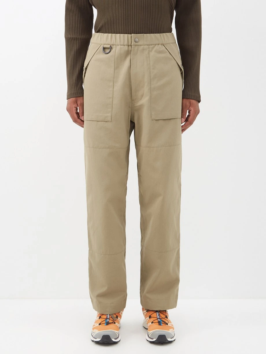 Snow Peak’s beige Takibi trousers are made from water-repellent ripstop blended from aramid – an ultra-durable polyamide fibre favoured for aerospace use – and organic cotton.
