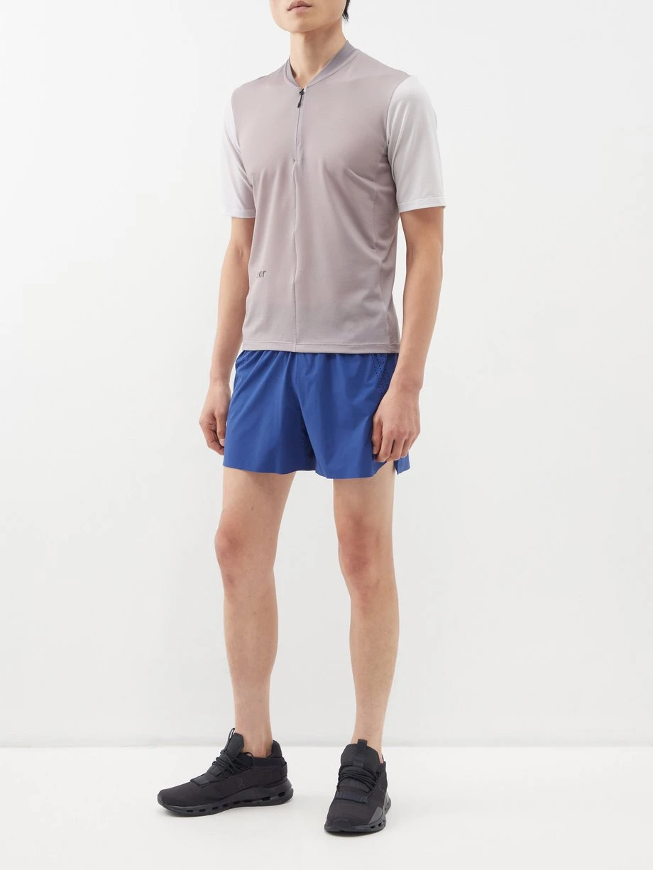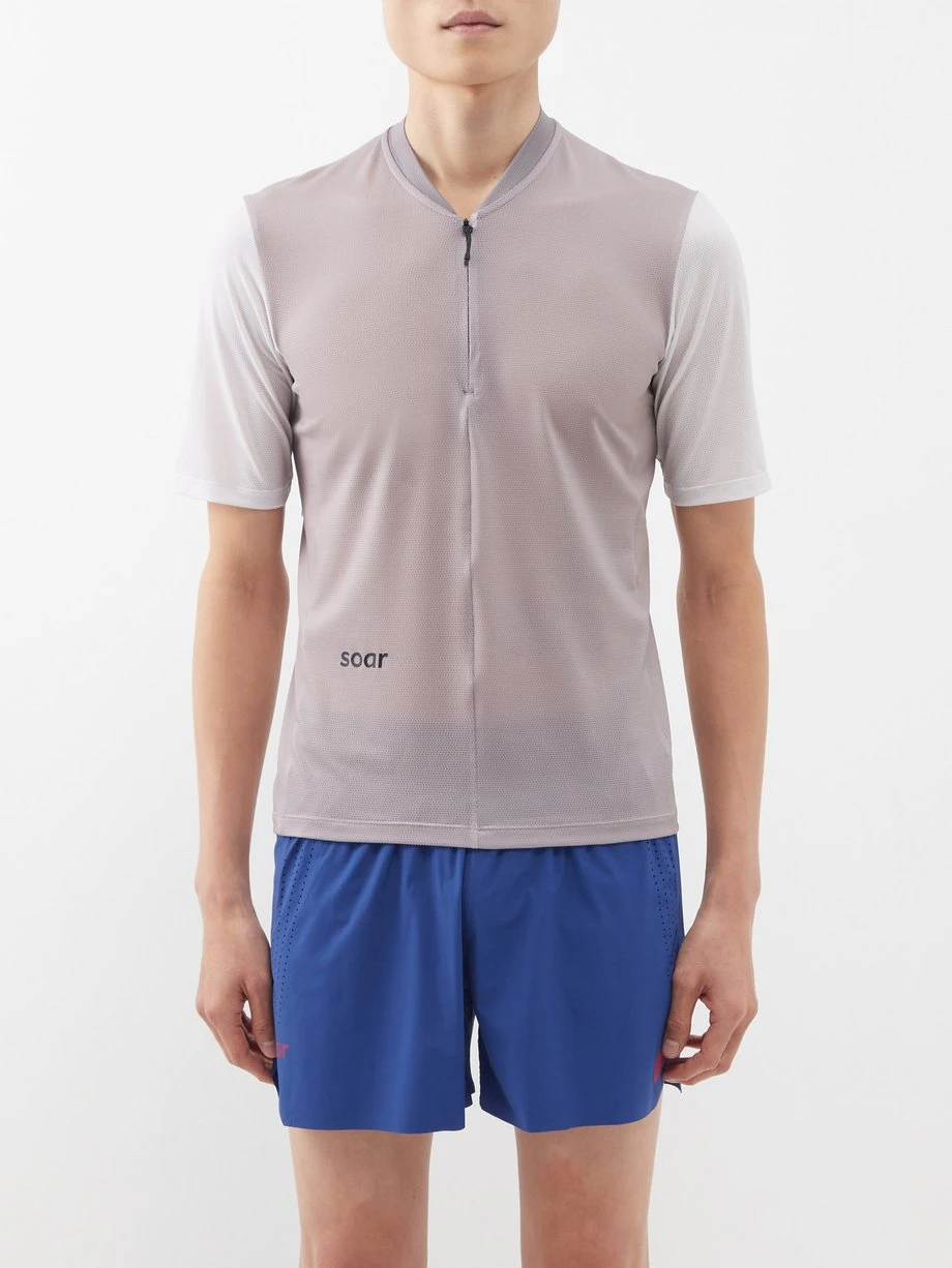 Crafted in the label’s innovative moisture-wicking mesh, SOAR’s grey 2.0 Hot Weather T-shirt spotlights a half-zip profile and bonded seams for optimum comfort when running.