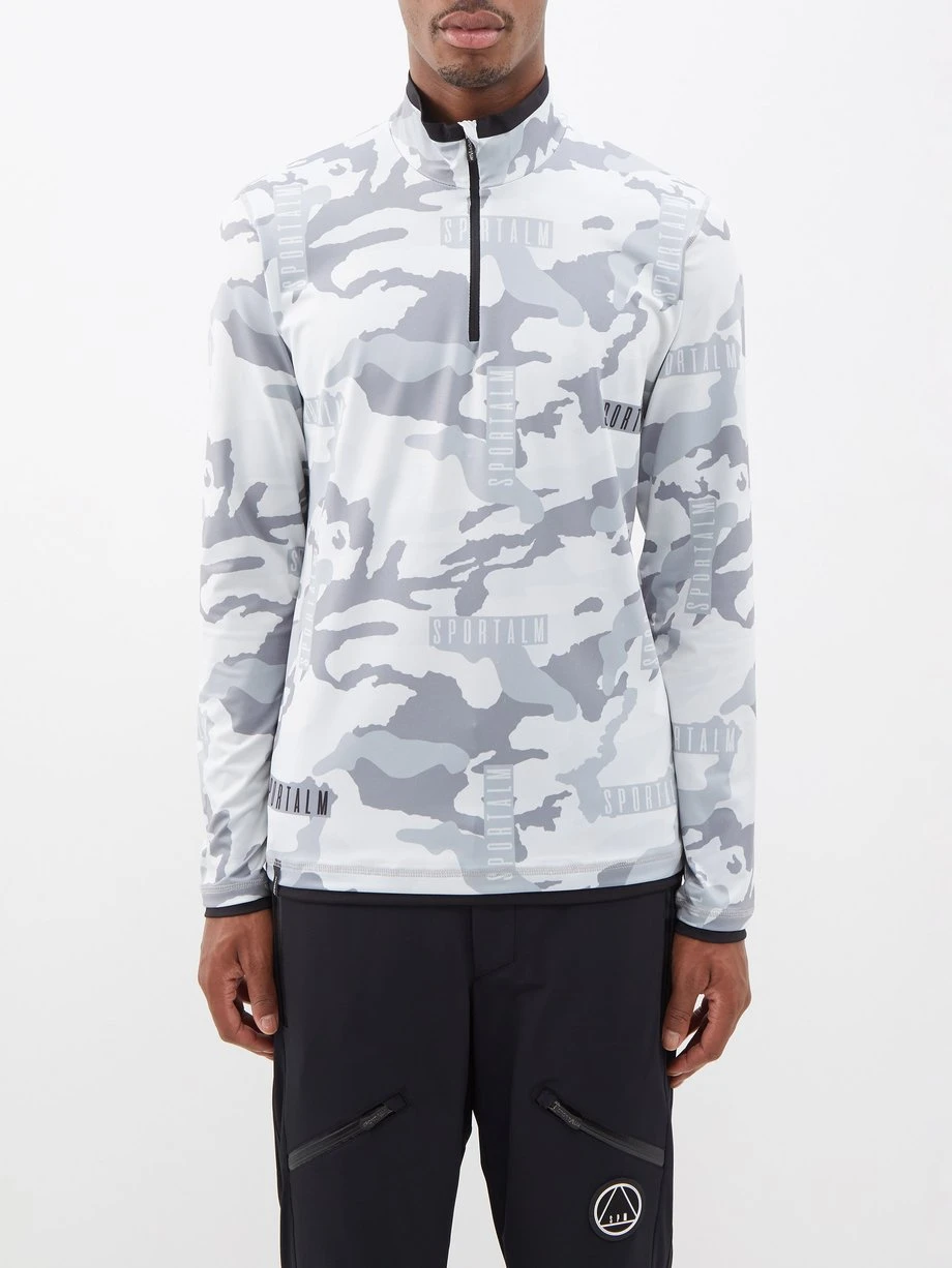Sportalm’s grey base-layer top is patterned with a muted camouflage print, inspired by the label’s alpine hometown of Kitzbühel in Austria. It’s made from insulating technical jersey and fitted with a quarter-zip neckline for adjustable airflow.