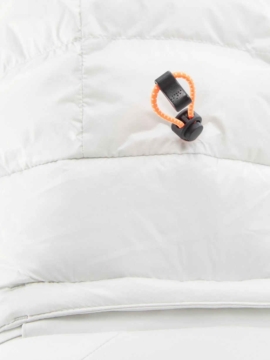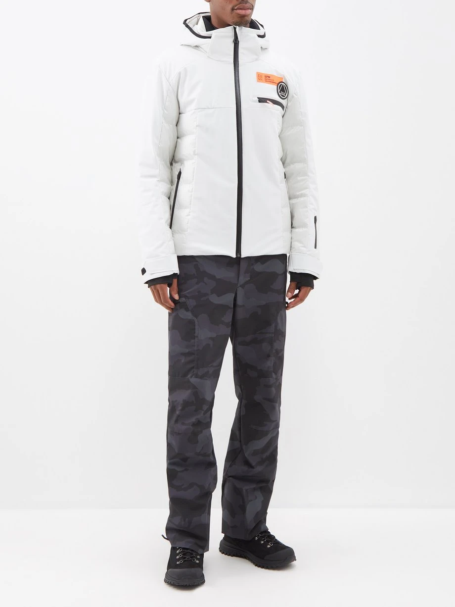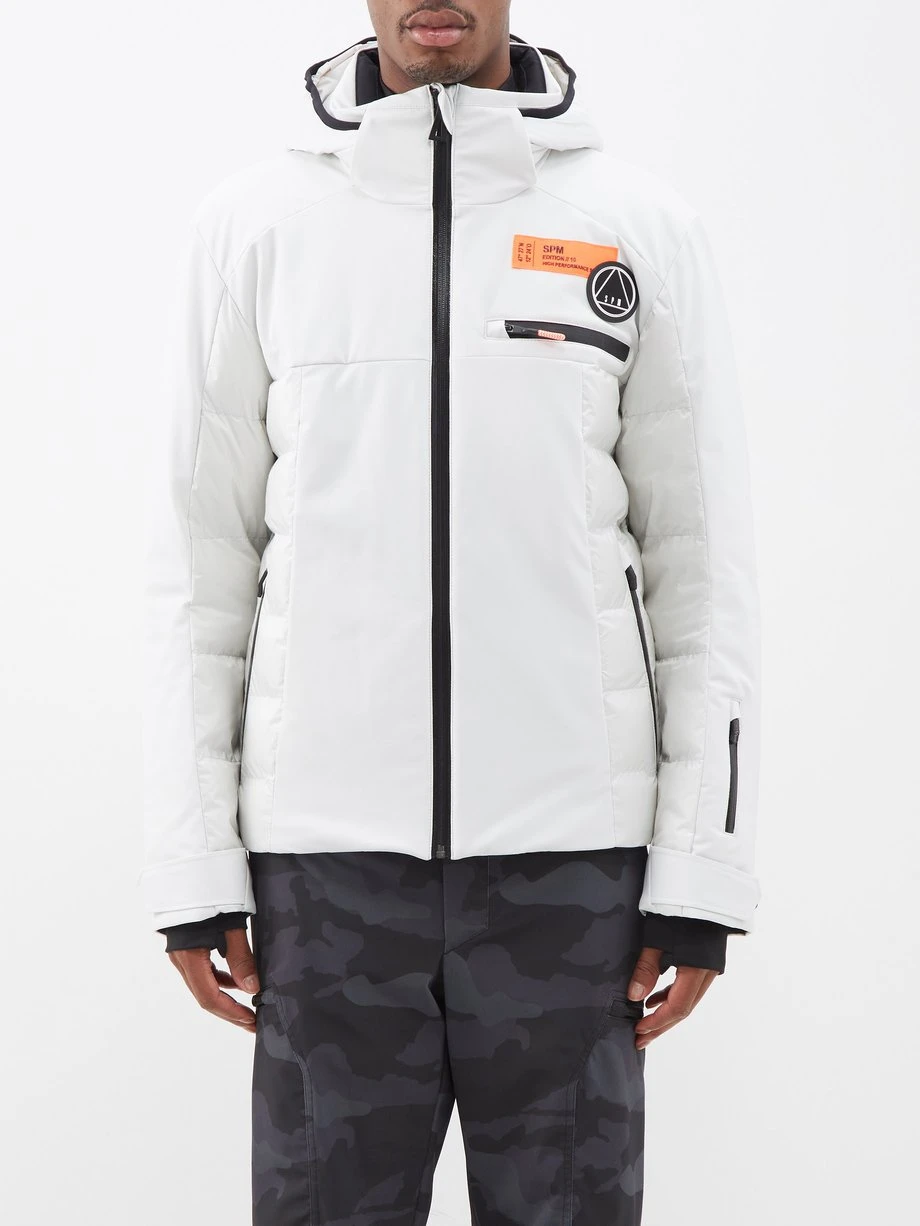 Sportalm’s stone-white quilted down jacket is filled with down and feathers for lightweight insulation. It’s fitted with plenty of waterproof zips, including one at the sleeve for a ski pass, and cinches at the hood and waist with a drawcord to keep moisture at bay during alpine pursuits.