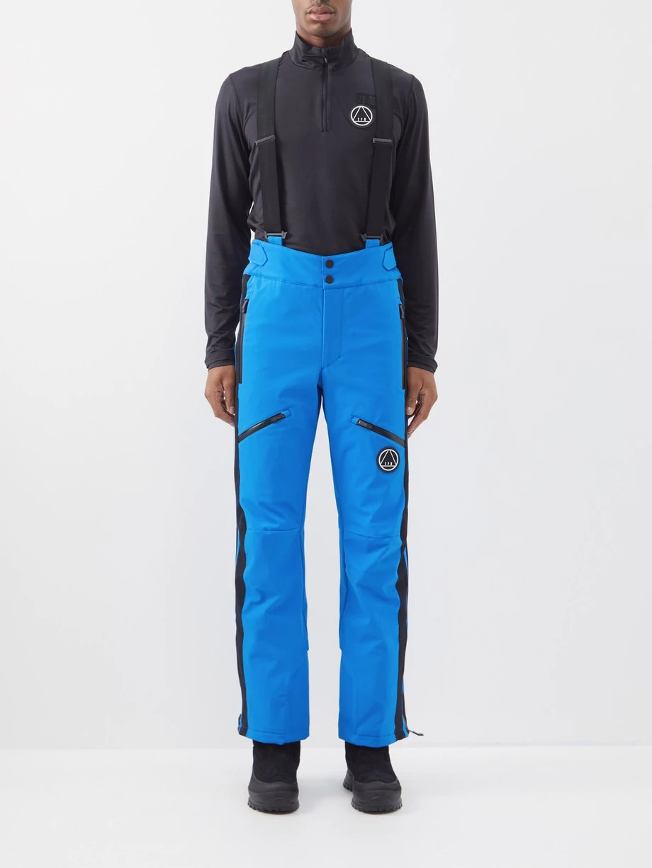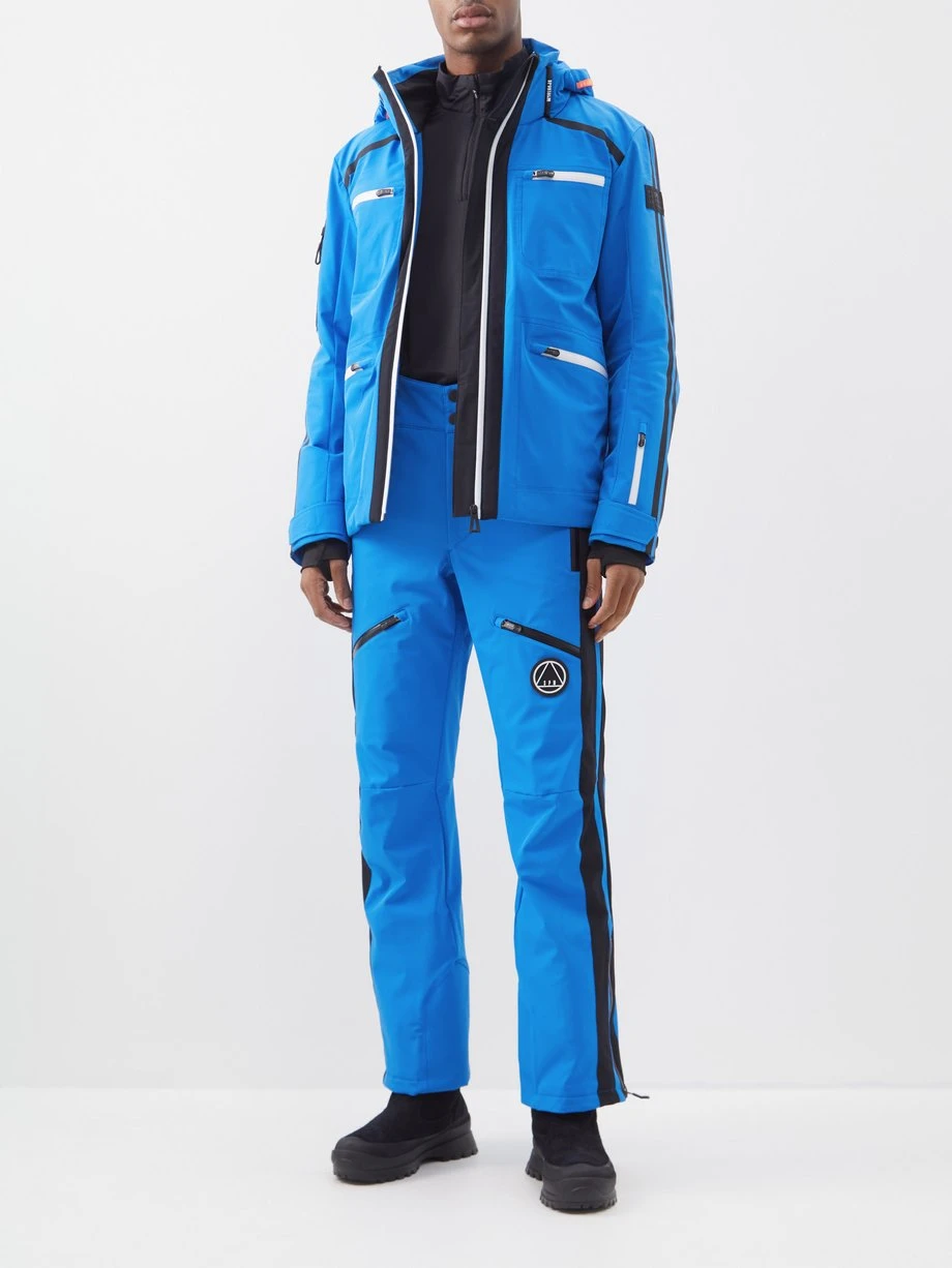 For a bold statement on the slopes opt for Sportalm’s bright blue ski trousers, accented with black side stripes, a rubber logo patch and SPM embroidery. The high-rise silhouette is rendered in waterproof four-way stretch fabric and features crossover suspenders, adjustable waist tabs and six zipped pockets.