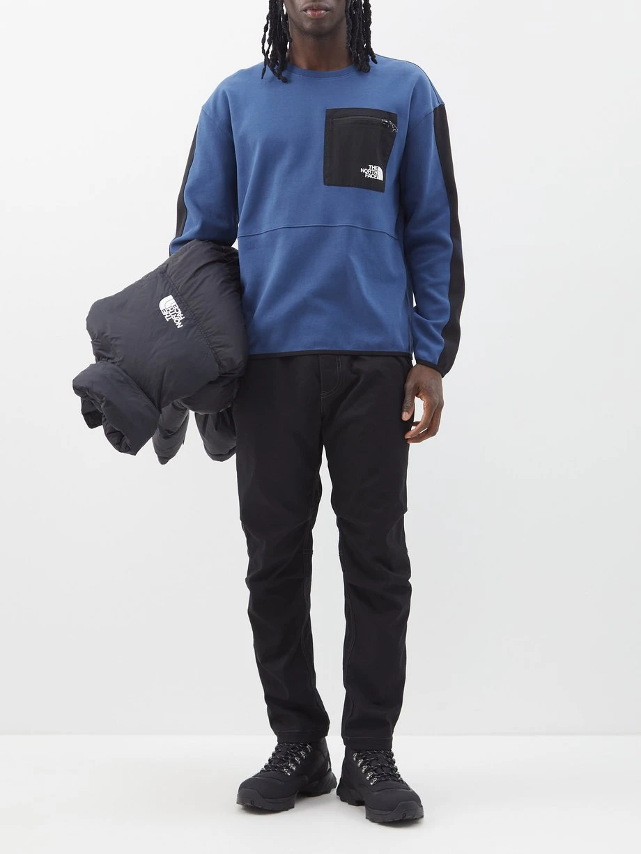 The North Face’s blue sweatshirt is crafted from a soft cotton blend with a sportswear-inspired nylon zip pocket and white printed logos.