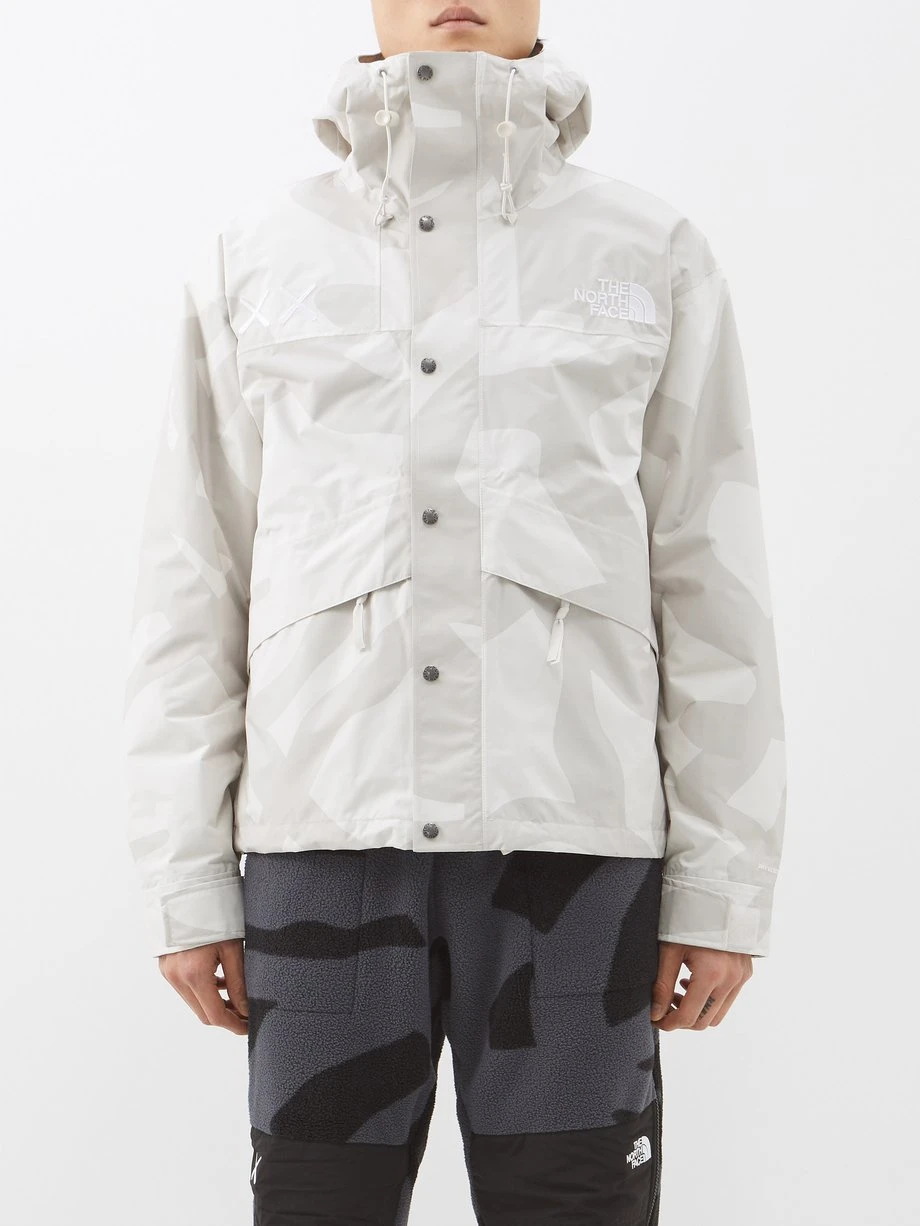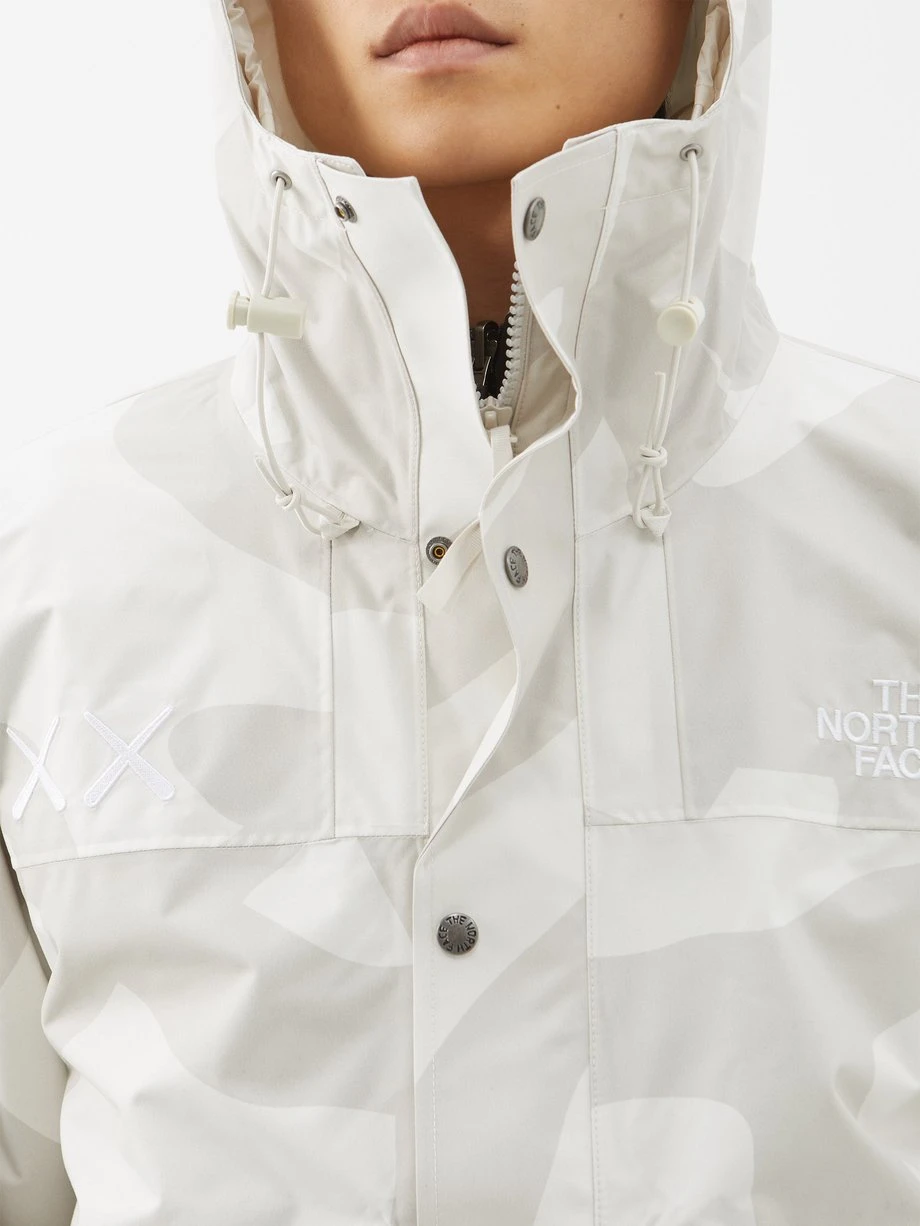 Ideal for excursions in drizzly weather conditions, The North Face X Kaws’ grey hooded Retro 1986 Mountain jacket is covered in a waterproof DryVent coating.