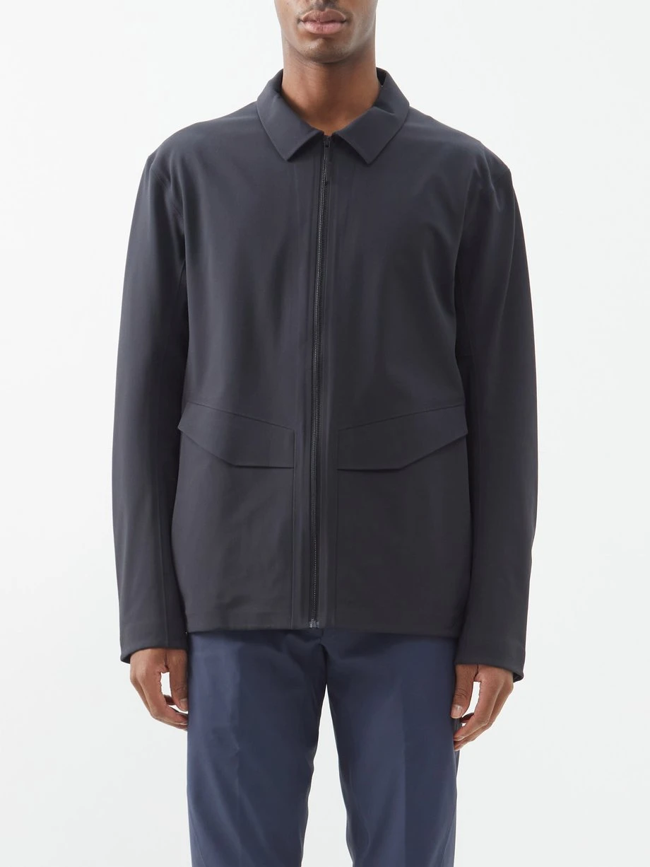 Veilance makes minimalist staples that provide ample protection against the elements, such as this black Spere jacket, cut from a windproof and water-resistant nylon blend.